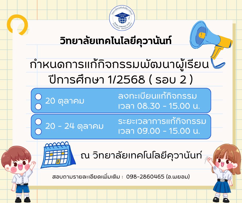 ประชาสัมพันธ์ เรื่องกำหนดการแก้กิจกรรมพัฒนาผู้เรียน ปีการศึกษา 1/2568